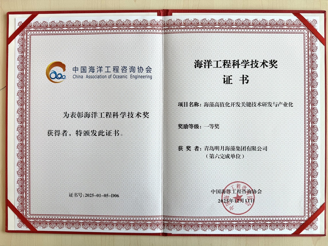 12月,明月海藻集团荣获"海洋工程科学技术奖"。